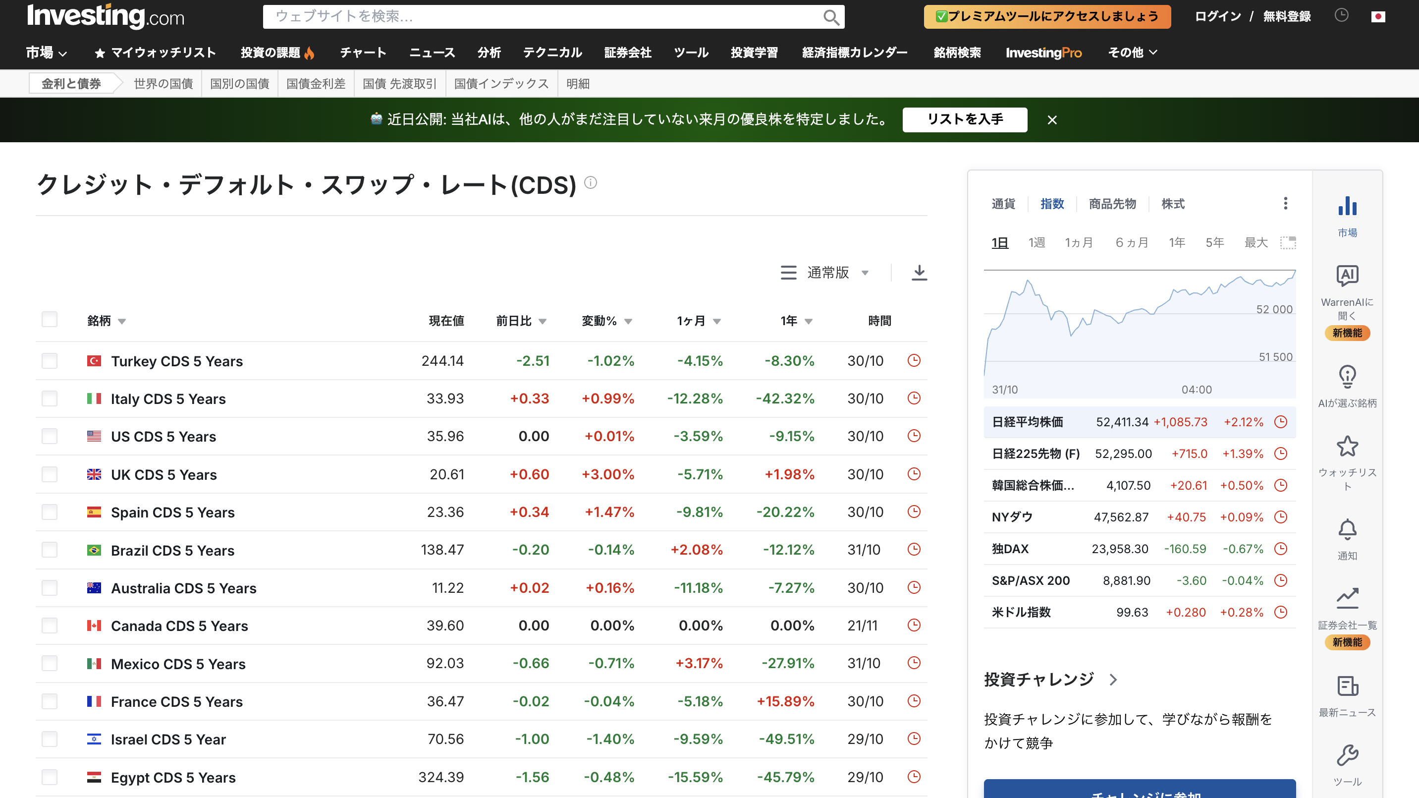 下記のサイトで、各国のCDSのプレミアム(保険料)をチェックすることができます。