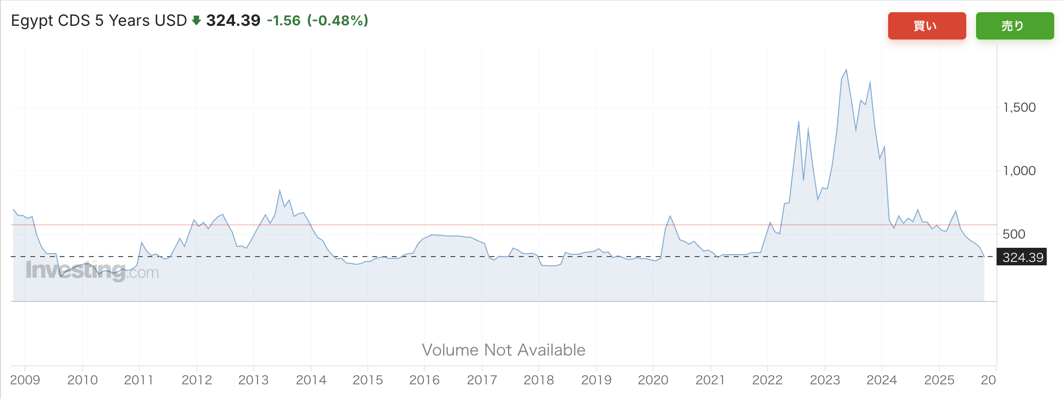 逆に『エジプト国債の5年物クレジット・デフォルト・スワップ(CDS)』は2023年以降、プレミアム(保険料)が下がり続けているため、マーケットでは『エジプト国債のデフォルト率が下がってきていると判断している』と言えるわけです。