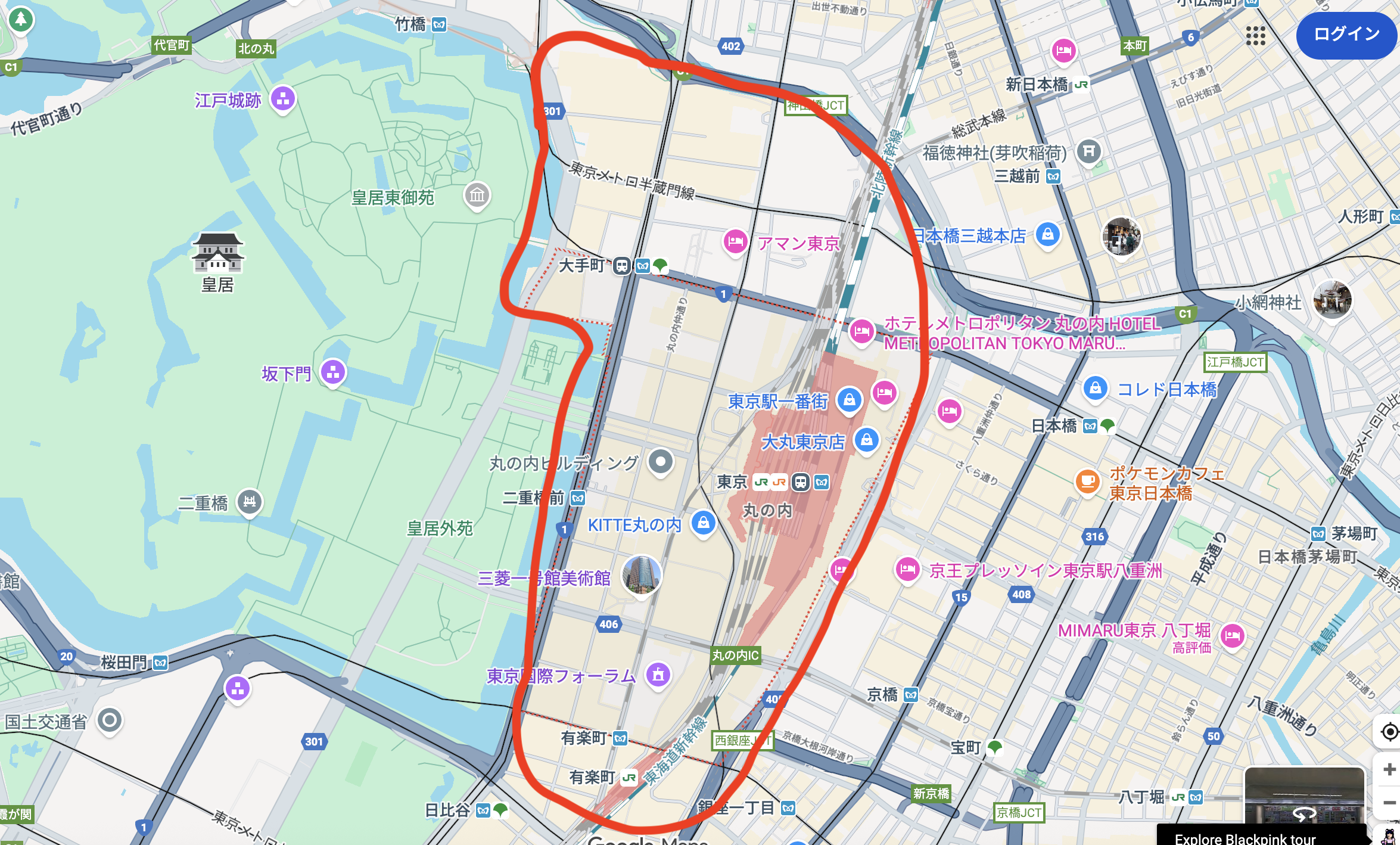 しかし、少なくとも東京駅を中心とした「有楽町・丸の内・大手町」(下記の地図で赤枠に囲まれたエリア)は、「超一等地」と表現しても異論は少ないでしょう。