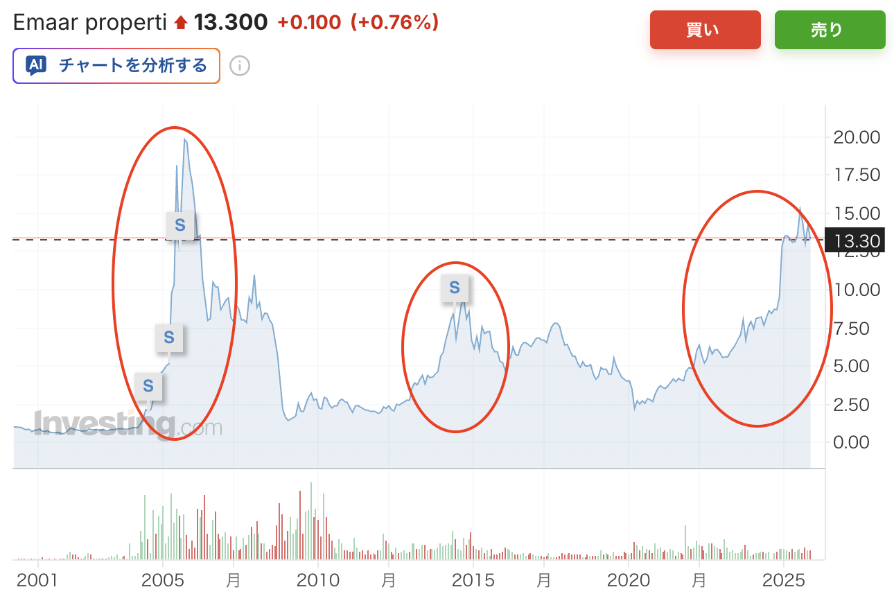 これらの局面は、ドバイ不動産市場の盛衰にほぼ連動しており、Emaar の株価は“ドバイ不動産市場を映す鏡” として、多くの投資家が参考にしています。