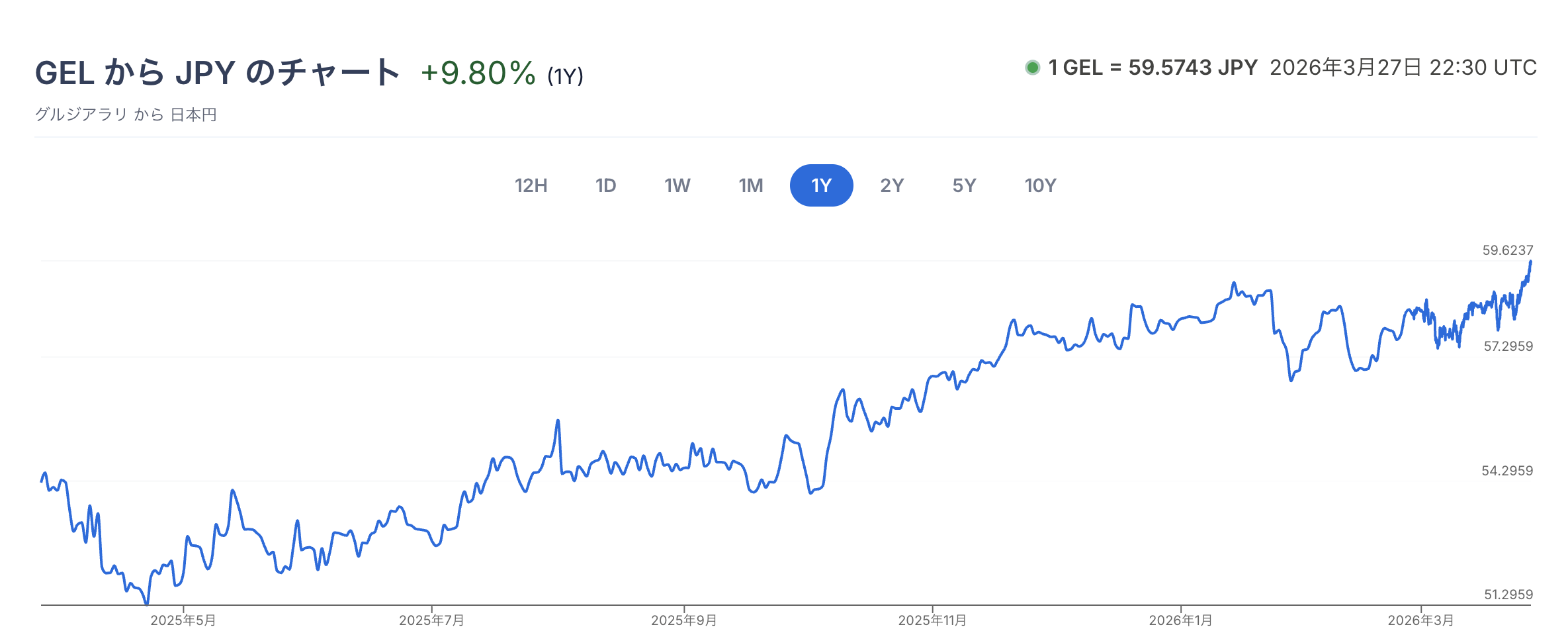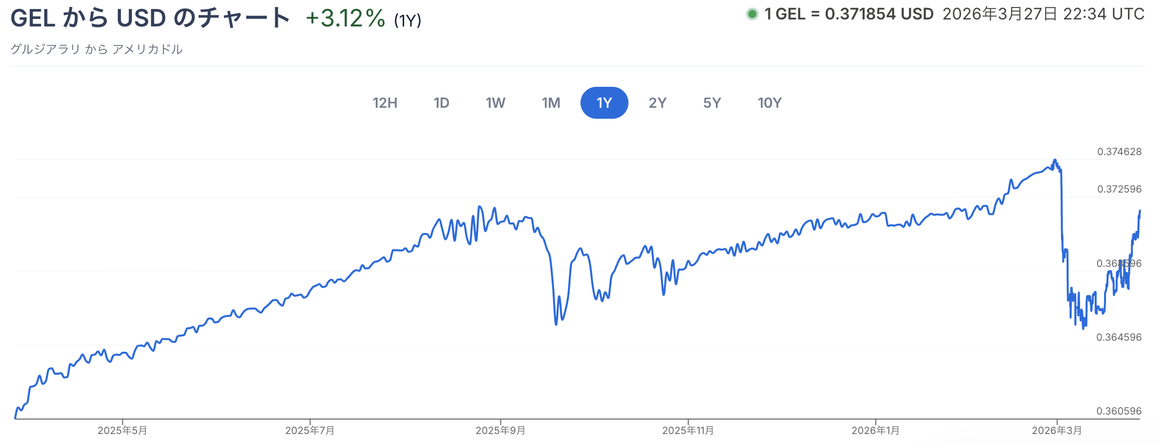 2026年3月現在、USD/GELのレートは約2.70前後で推移しており、過去12ヶ月間で1.42%の上昇を記録しています。短期的には3月に若干の下落(月間で0.93%)が見られましたが、年間ベースではGELが米ドルに対して堅調な動きを示しています。